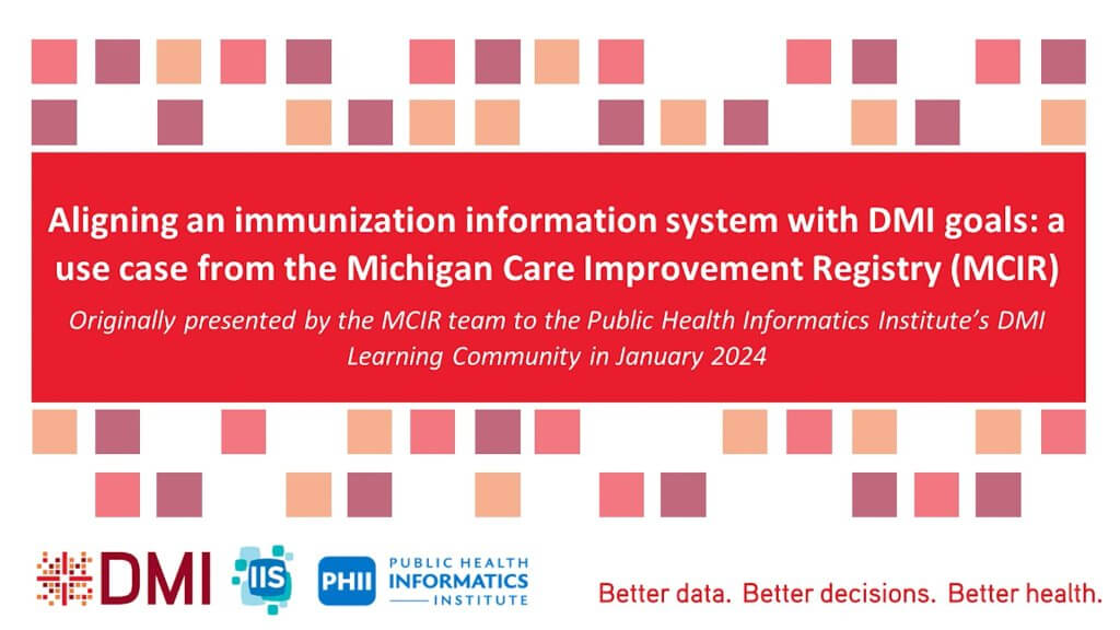 In 2024, a team from the Michigan Care Improvement Registry (MCIR) joined the Public Health Informatics Institute’s Data Modernization Initiative Learning Community call to share their lessons learned from data modernization. This presentation offers one example of considerations an immunization information system (IIS) team may have when working to align with DMI goals, and may offer insights to other IIS programs and public health agencies looking to explore alignment with the Data Modernization Initiative.